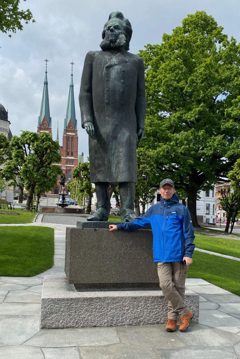 Dirk Stegner vor dem Denkmal des "Friluftsliv-Erfinders" und Lyrikers Henrik Ibsen in Skien (Norwegen, Telemark).
